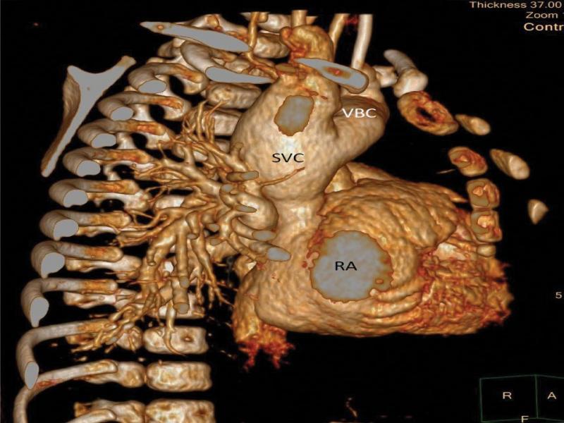 The heart seen from the right side, 3D angio-CT reconstruction. From this perspective, the unusual dilatation of the distal SVC as well as the left brachiocephalic vein (VBC) with relatively narrow proximal part of SVC is more apparent
