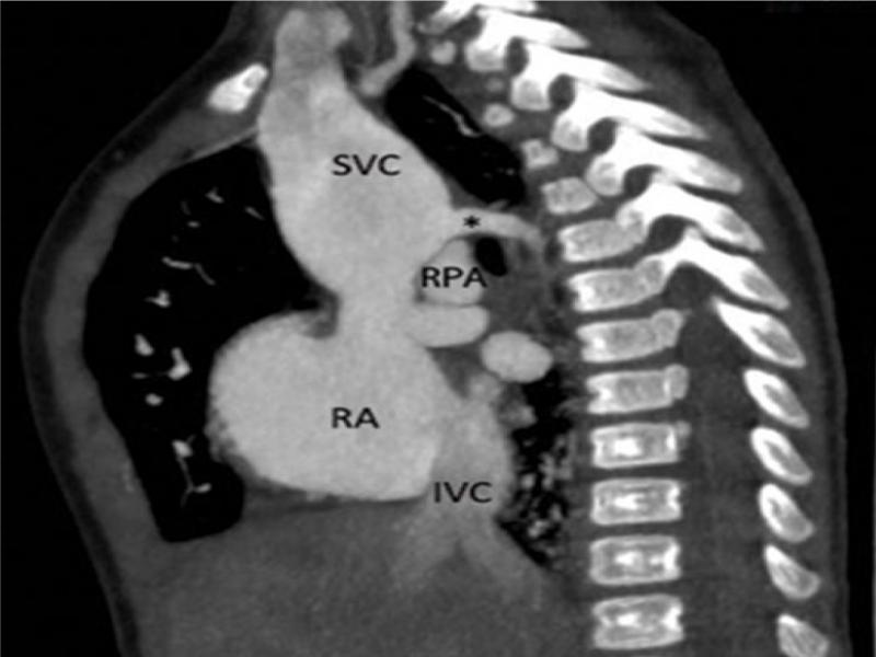 A corresponding 2D CT-angiographic view. The marked disproportion between the proximal and medial and distal part of the SVC is apparent. The prominent venous channel joining the SVC just above the crossing with RPA has typical features of azygos vein (*); runs in sagittal plane, emerges from the paravertebral space, does not receive any veins from the lungs