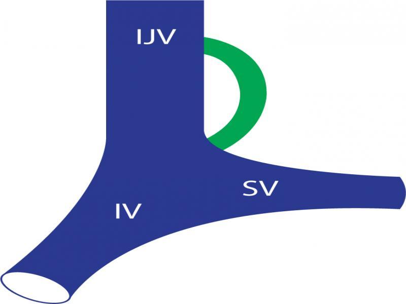 Anatomy of the jugulo-subclavian angle. Green vessel represents the thoracic duct. IV – innominate vein, IJV – Internal jugular vein, SV – sublavian vein