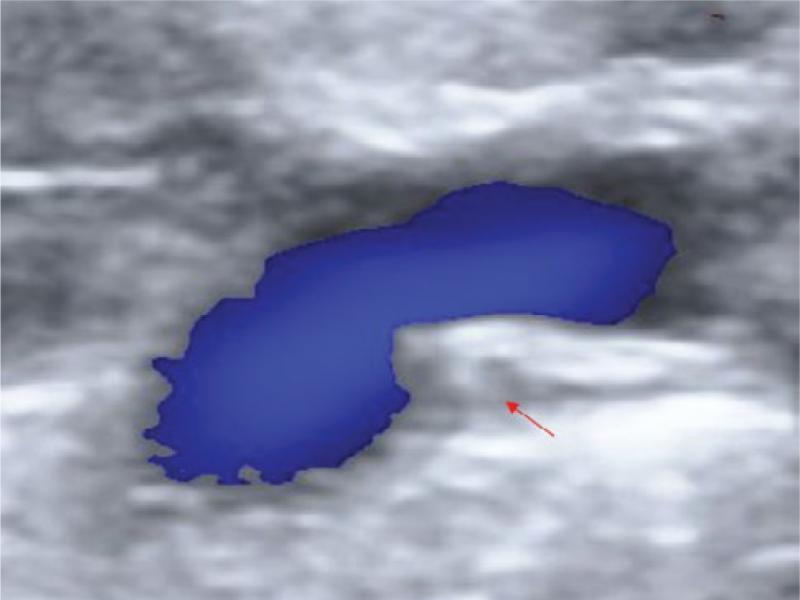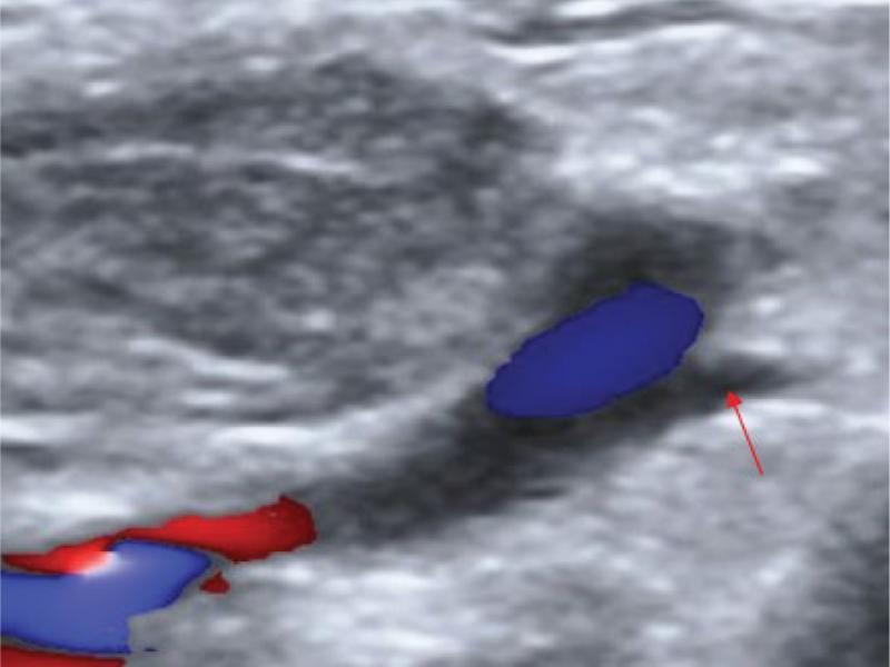 Ultrasonography of the jugulo-subclavian angle. Thoracic duct (red arrow)
