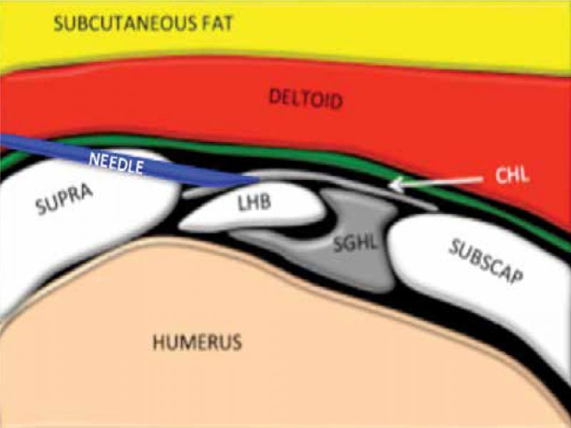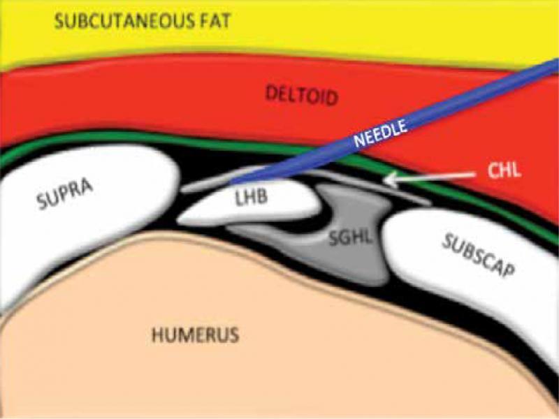 Schematic diagram of rotator interval showing needle tip in target zone via medial to lateral approach