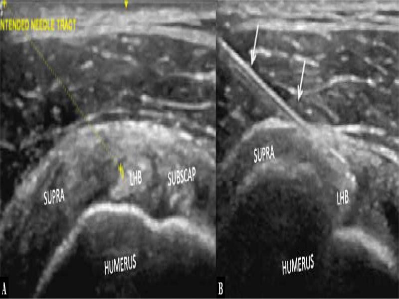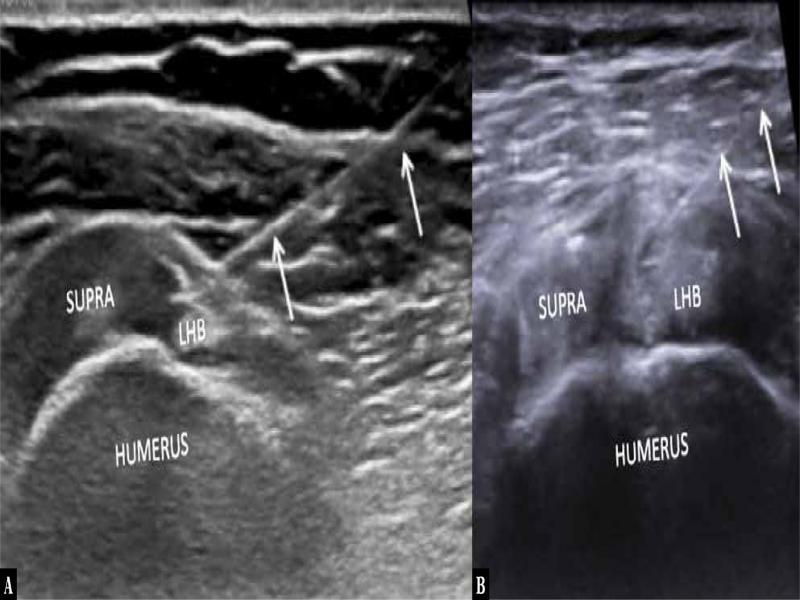 Ultrasound-guided injection of the RI is an established technique for hydrodilatation, intra-articular injection, and arthrograms(1–3). The procedure is performed via a lateral to medial approach. The target for the approach is the interval between the long head of the biceps and the CHL. The orientation of the CHL is parallel to the superior configuration of the LHB. In the lateral to medial approach, the target zone is 0.5 mm (average). It can be challenging to precisely insert the needle tip in this narrow target zone, especially for beginners, and this could result in inadvertent injection into the LHB. Moreover, this approach involves traversing the supraspinatus tendon.