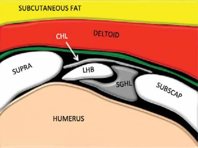 Schematic anatomy of rotator interval. LHB (long head of biceps), SGHL (superior glenohumeral ligament), SUBSCAP (subscapularis), CHL (coracohumeral ligament), SUPRA (supraspinatus)