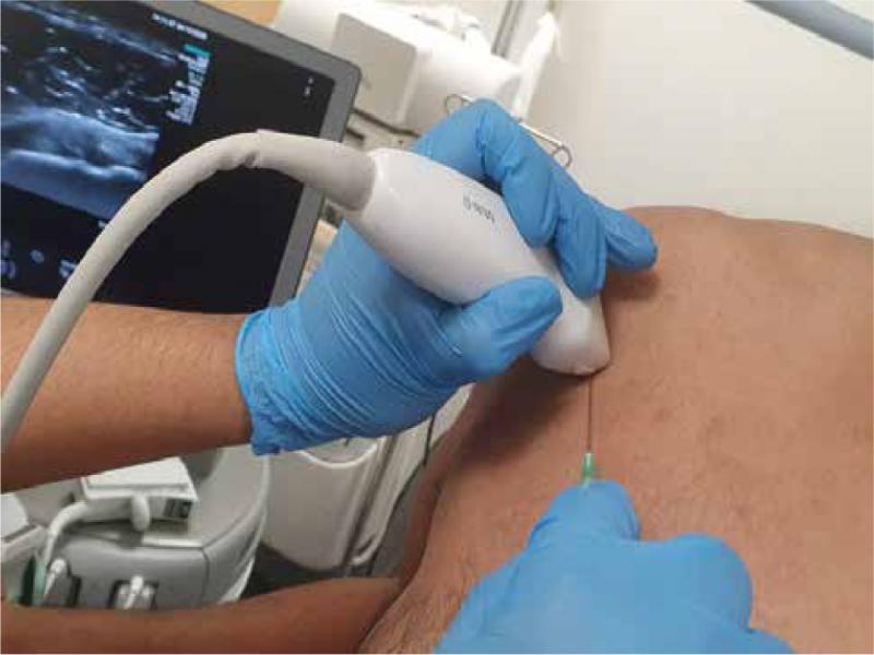 The patient is supine, with the ipsilateral arm in external rotation. A high-frequency (15 MHz) linear transducer is placed over the LHB in the axial position over the rotator interval. The LHB is seen as a hyperechoic ellipsoid structure with a thin anterior hypoechoic CHL and a relatively thicker hypoechoic SGHL, medial and inferior to the LHB. Skin disinfection is required, but skin anaesthesia may or may not be necessary. A needle (21G, 22G or 23G, depending on the operator) is inserted into the interval between the CHL and LHB, via a medial to lateral approach, traversing through the deltoid (Fig. 4, Fig. 5, Fig 6). The injectate is then injected into the target zone with a free flow indicating successful placement of the needle.