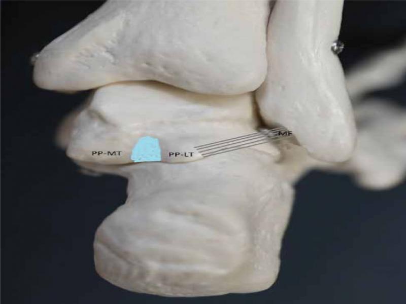 Anatomy of the PTFL (PP-LT – lateral tubercle of the posterior process of the talus, PP-MT – medial tubercle of the posterior process of the talus, light blue area – sulcus of the flexor hallucis longus tendon, MF – malleolar fossa of the lateral malleolus, grey lines – typical course of the posterior talofibular ligament)