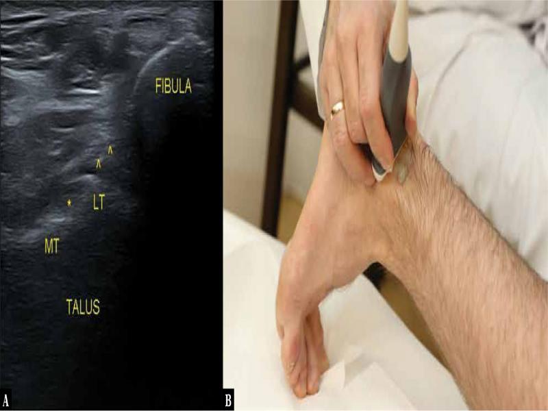 A. Ultrasound image of the posterior talofibular ligament (MT – medial tubercle of the posterior process of talus, LT – lateral tubercle of the posterior process of talus, asterisk – tendon of flexor hallucis longus, arrowheads – posterior talofibular ligament localization), B. Positioning the patient and the ultrasound probe in PTFL imaging
