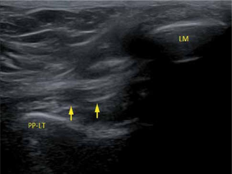 The course of PTFL on an ultrasonography image (PP-LT – lateral tubercle of the posterior process of the talus, LM – lateral malleolus, arrows – posterior talofibular ligament)