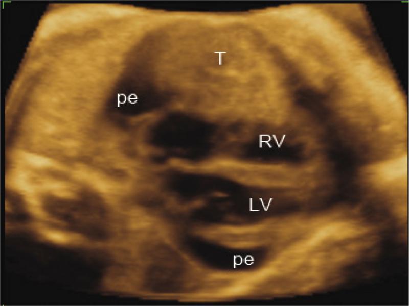 Original two-dimensional echocardiography picture which was taken during the first echocardiography exam. Pericardial effusion (pe) is seen. Large pericardial tumor (T) is located in front to the right ventricle (RV)