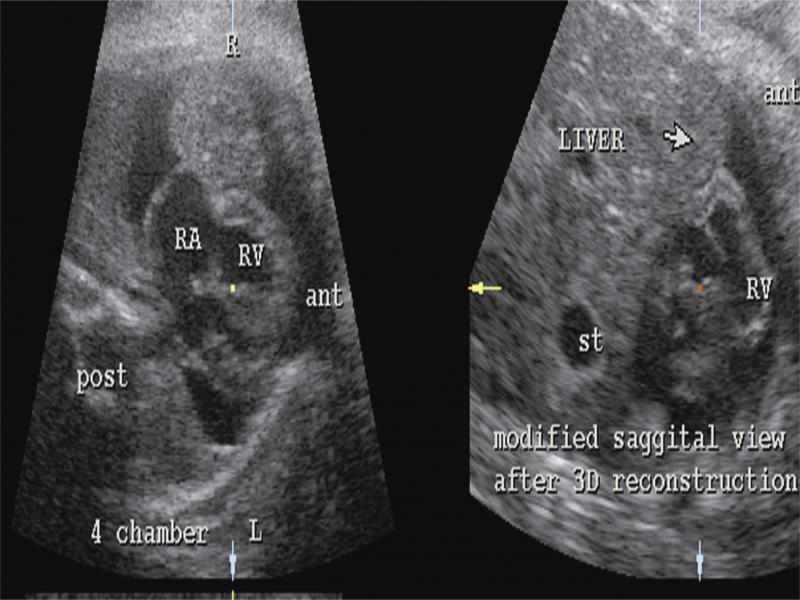 Retrospective offline reconstruction from the echocardiography examination. Left-side picture: referral image in which the pericardial tumor with pericardial effusion is seen (corresponding to the Fig. 1). ant – anterior, post – posterior, RA – right atrium, RV – right ventricle, L – left, R – right. Right-side picture: modified sagittal view reconstruction from the STIC volume. The “tumor” is identified as part of the liver herniating into the pericardial cavity (arrow). st – stomach
