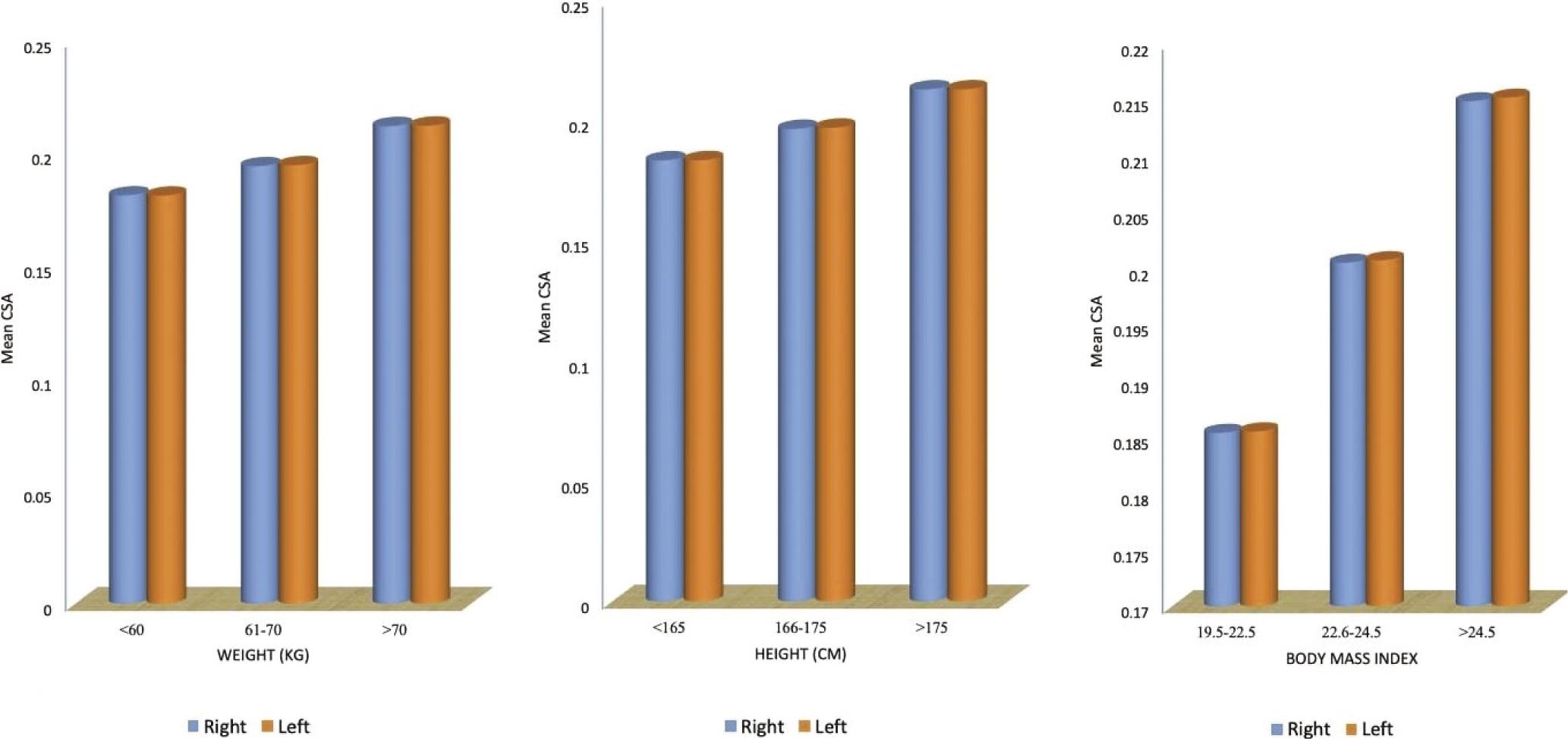 | 5. | Singh et al. performed study on radial nerve(17). | Strong correlation between the CSA of the radial nerve and height, weight, BMI was seen with no statistically significant correlation with age. Males had higher CSA values for the radial nerve than females. |