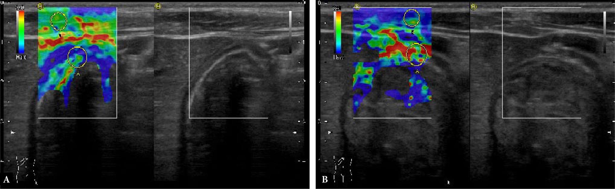 Elastography is a method for visualization of elasticity and hardness of tissues by evaluating their response to an applied force(9). Hard tissues respond differently to compression compared to soft tissues. Hard tissues displace as a whole without deforming as opposed to soft tissues. For this reason, hard tissues have strain values lower than those of soft tissues(10). Strain index is calculated by dividing the strain value of the tissue by that of the surrounding structure. As expected, less compressible and less deformable hard tissues have higher strain index values. Strain elastography, an inexpensive and non-invasive new visualization method increases the usefulness of ultrasonography in different situations(11–15).