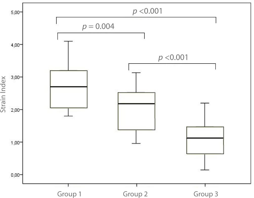 The mean strain index values were 2.7 in H. pylori (+) gastritis group (group 1), 2.2 in H. pylori (-) gastritis group (group 2), and 1.4 in the control group (Fig. 1). Both group 1 and group 2 had significantly higher strain index values compared to the control group. Additionally, group 1 had a significantly higher mean strain index value than group 2 (Fig. 2).