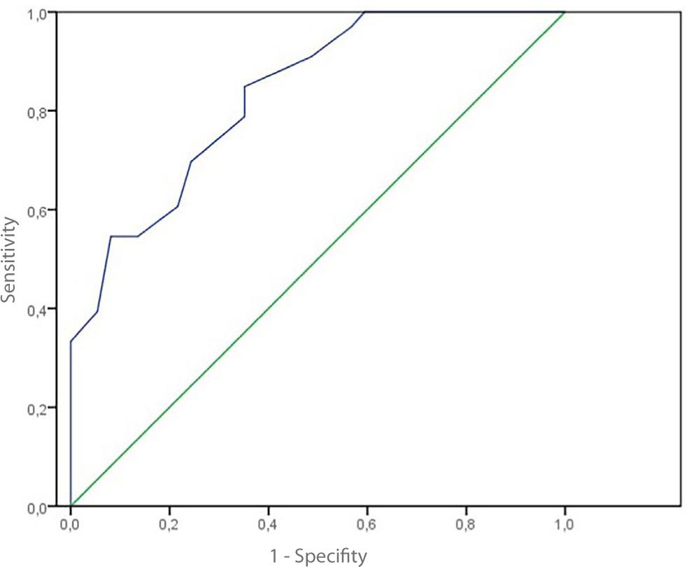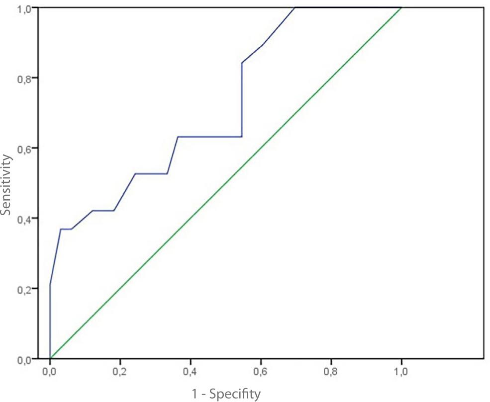 Strain index determined by US-EG was not correlated with body mass index, gender or age (Tab. 2). AUC was calculated to evaluate its utility in diagnosing gastritis using the strain index determined by US-EG. A value of 0.873 was determined as a good AUC. When a 1.6 cut-off point was taken, its sensitivity in diagnosing gastritis was 90.4%, its specificity was 65%, and its accuracy was 73.9% (Fig. 3). In addition, the ability of strain index to diagnose H. pylori gastritis among gastritis patients was also calculated. AUC was estimated at 0.720. When a cut off value of 2.0 was taken, the diagnostic sensitivity, specificity and accuracy were 84.2%, 54.5 and 68.1%, respectively (Fig. 4).
