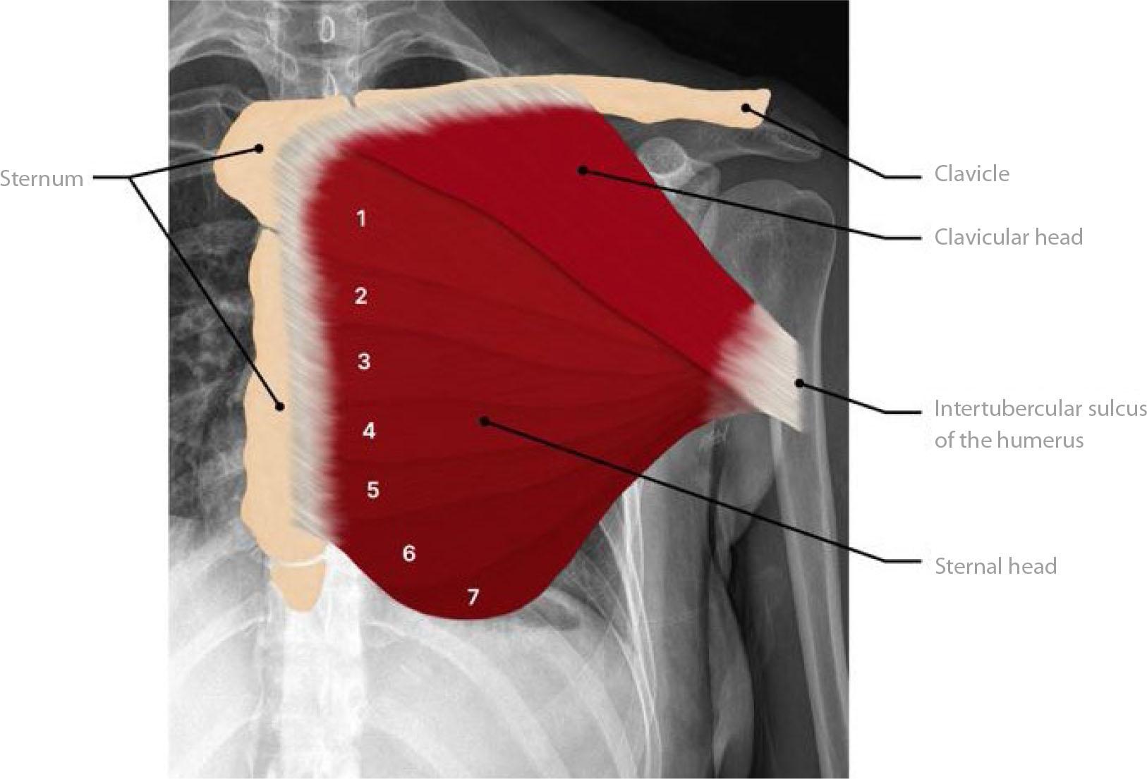 Anatomical drawing of the pectoralis major (PM) muscle superimposed on a frontal chest radiograph demonstrates the singular clavicular head and seven labeled segments of the sternal head