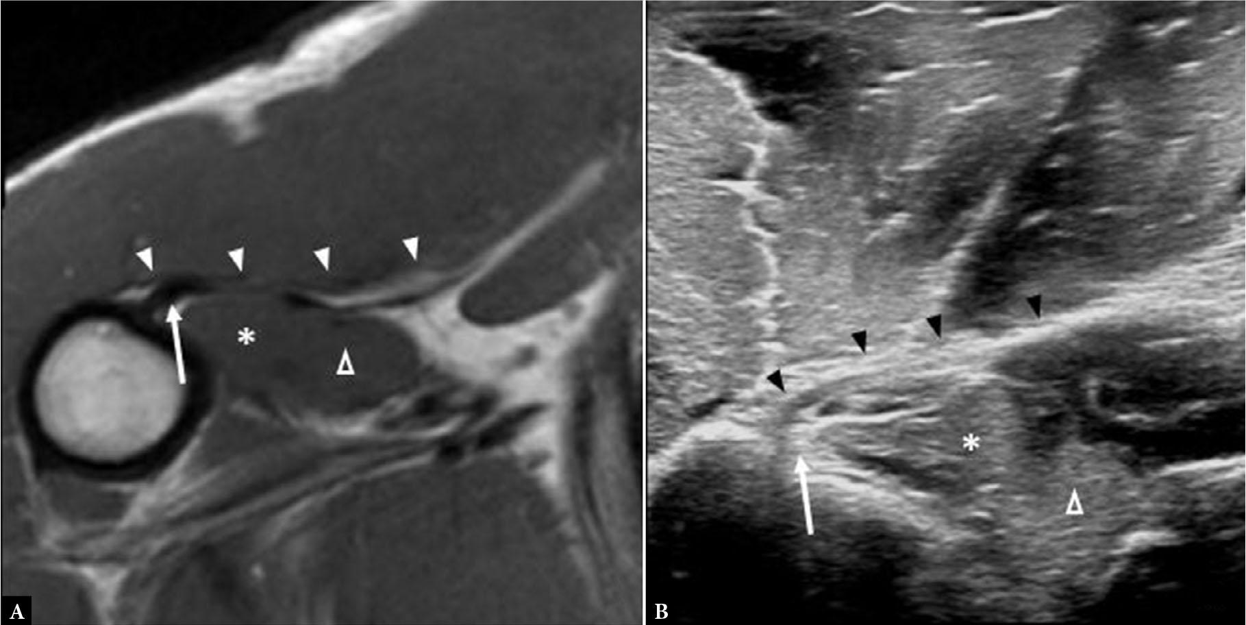 Axial T1-weighted MR image (A) and long axis gray scale ultrasound image (B) of the arm show the relationship between the PM tendon (solid arrowheads) and the regional anatomy: long head biceps brachii tendon (arrow), short head biceps brachii muscle (asterisk), and coracobrachialis muscle (open arrowhead)