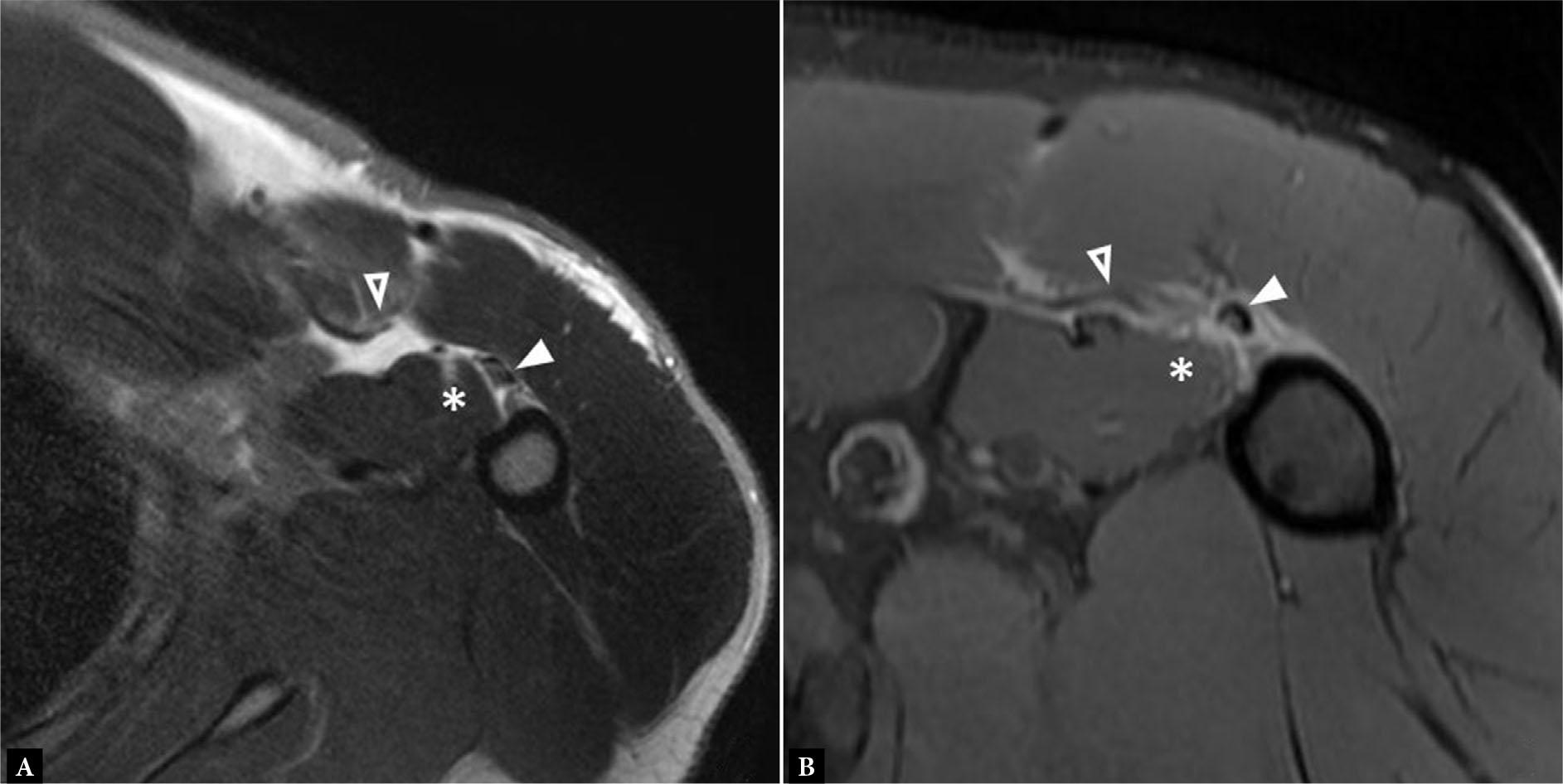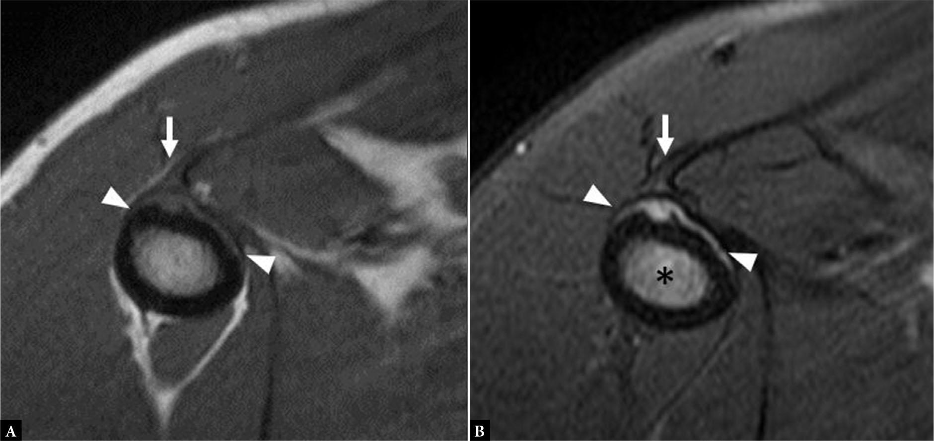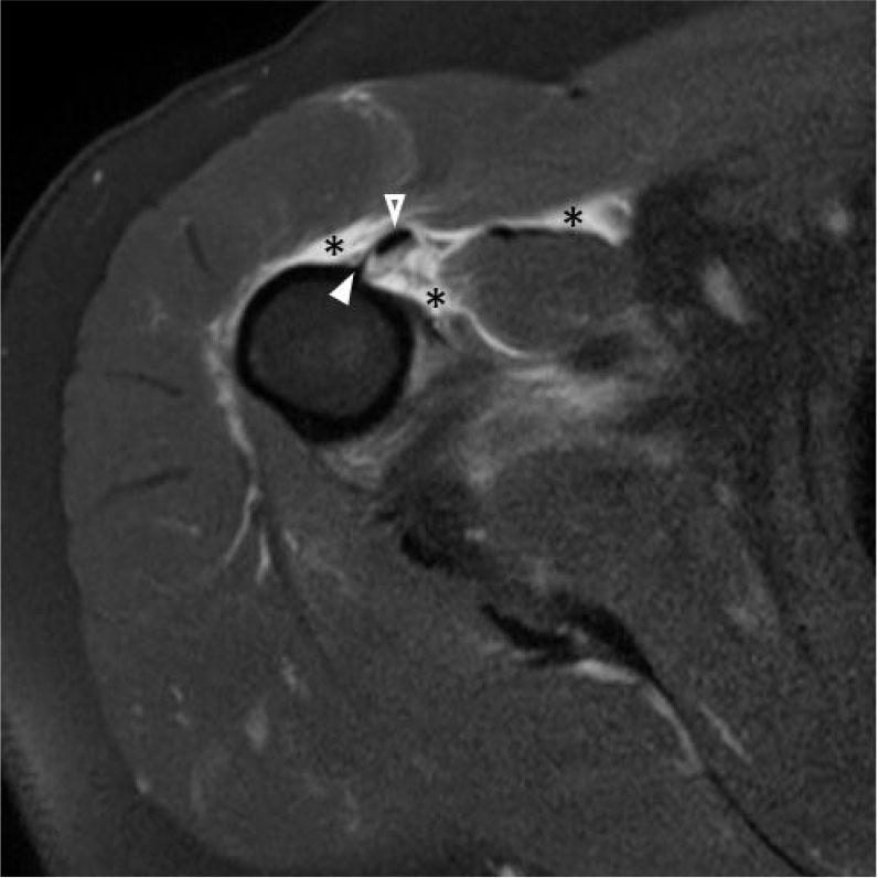 Axial fluid-sensitive MR image of the arm with FOV tailored for pathology of the shoulder shows edema (asterisk) about the long head biceps tendon (open arrowhead) with anterior positioning of the tendon with respect to the humerus on the most inferior axial image, in keeping with PM tear. Note the residual stump of the PM tendon on the humerus (solid arrowhead)