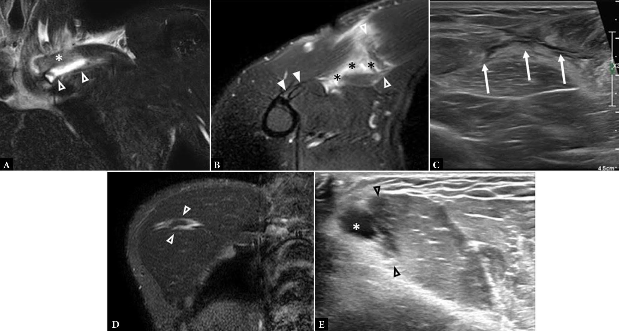 A. Coronal fluid-sensitive MR image shows a PM tear at the clavicular head origin with edema (arrowheads) interposed between the clavicle (asterisk) and the muscle. B. Axial fluid-sensitive MR image shows a PM tear at the myotendinous junction (between empty arrowheads) with edema, fiber disorganization, and surrounding poorly organized hematoma (asterisks). Note intact tendon insertion onto the humerus (solid arrowheads). C. Short axis gray scale ultrasound image shows feathery anechoic fluid (arrows) tracking along the expected course of the pectoralis muscle fibers in the setting of intramuscular PM tear (not shown). D. Coronal fluid-sensitive MR image shows an intramuscular PM tear with edema and discontinuous fibers (arrowheads). E. Long axis gray scale ultrasound image shows an intramuscular PM tear with intramuscular edema at the site of tear (arrowheads) and more focal anechoic abnormality that represents a small intramuscular hematoma (asterisk)