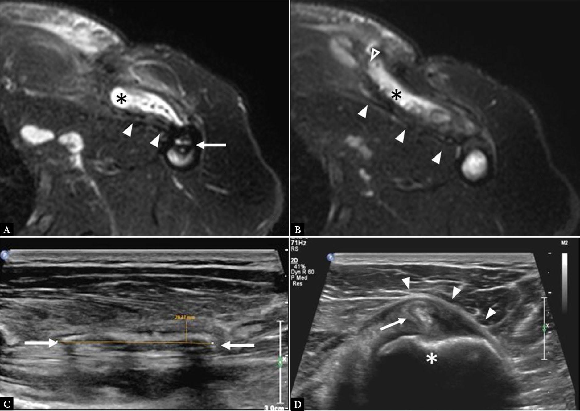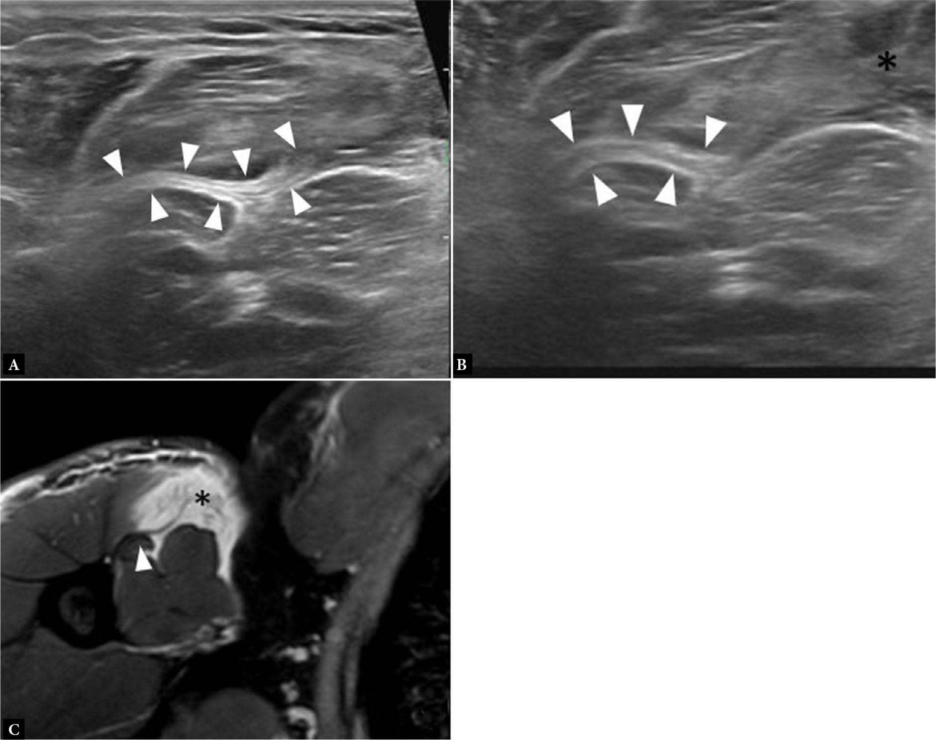A. Long axis gray scale ultrasound images (A and B) and short axis fluid-sensitive MR image (C) show complete tear of the PM tendon with residual tendon stump (arrowheads) attached to the humerus and hematoma formation (asterisk)