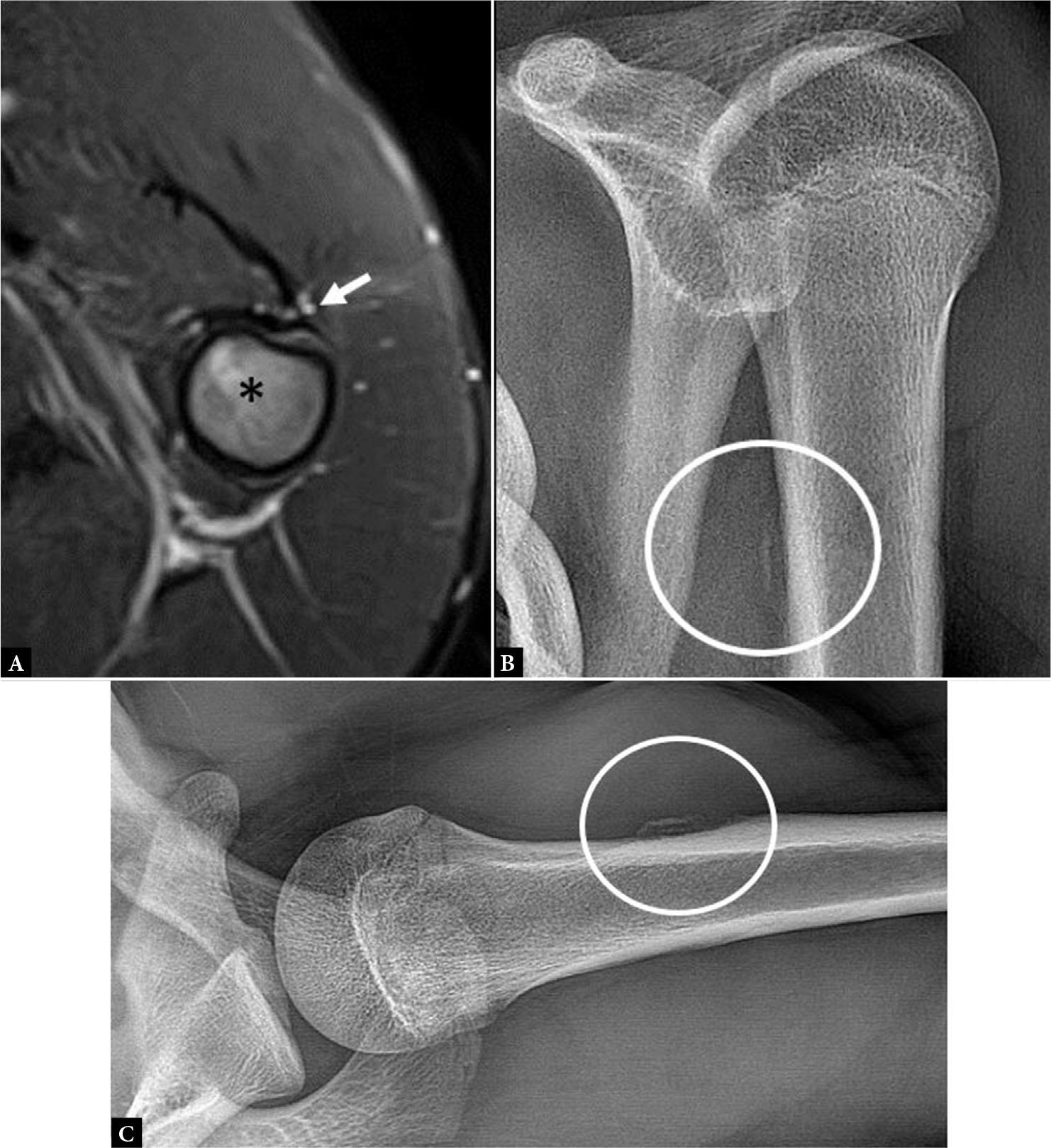 Axial fluid-sensitive MR image (A) shows avulsion of the PM tendon from the humeral insertion (arrow) with associated bone marrow edema (asterisk). AP (B) and axillary (C) radiographs of the shoulder show the avulsed cortical fragment from the anterior proximal humeral diaphysis (circle, B, C)