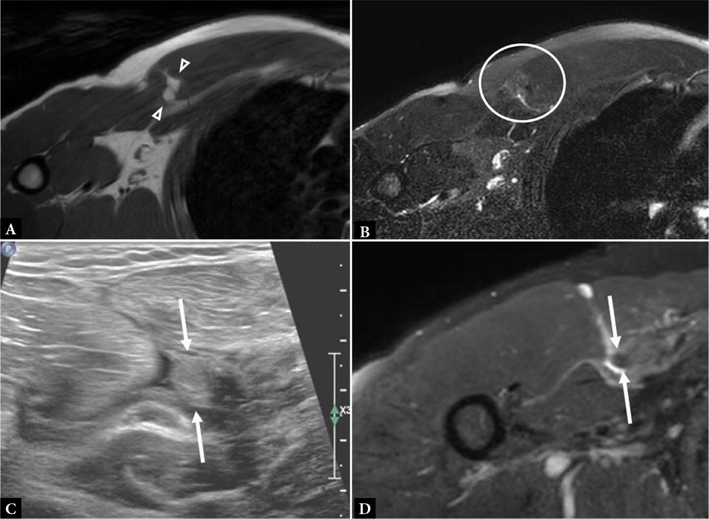 Axial T1 (A) and axial fluid-sensitive (B) MR images show focal fat at site of discontinuous muscle fibers (A, between arrowheads) from a chronic tear. Note the paucity of associated edema on the fluid-sensitive sequence (B, circle). C. Short axis gray scale ultrasound image shows a thickened and retracted torn PM tendon stump medially (between arrows). D. Corresponding MR image shows the retracted tendon stump (between arrows) with relative paucity of surrounding edema in this patient with chronic PM tear. Fibrosis was confirmed intraoperatively, which can also be seen with chronic tears