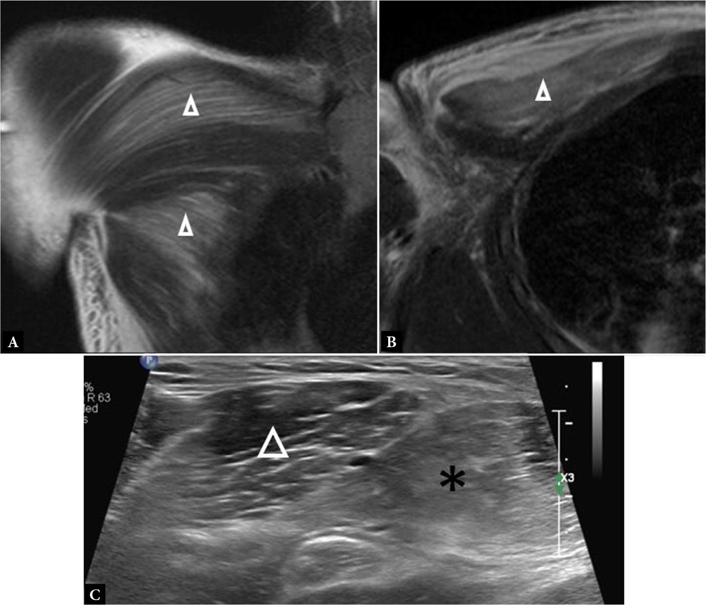 Coronal (A) and axial (B) fluid-sensitive MR images show diffuse, feathery signal hyperintensity in the PM muscle (open arrowheads) without fiber disorganization or laxity, consistent with PM strain. C. Long axis gray scale ultrasound image in another patient demonstrates increased echogenicity and poorer fiber conspicuity in a patient with strain of the clavicular head of the PM (asterisk). Note the normal architecture of the adjacent deltoid muscle (arrowhead). There is no frank fiber disruption or disorganization in these images to suggest tear