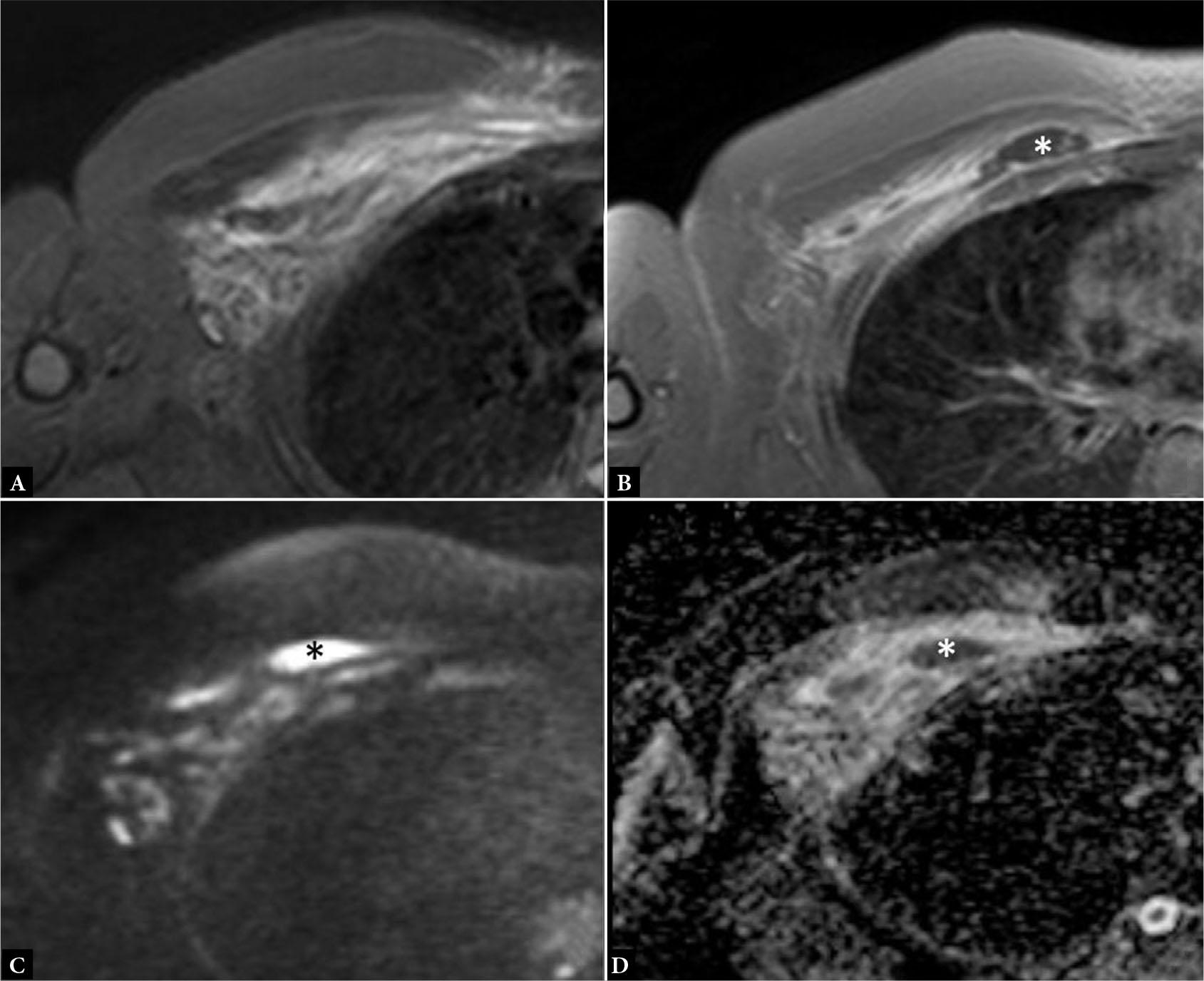A. Axial fluid-sensitive MR image shows hyperintensity in the PM muscle. B–D. Post contrast axial T1 MR image with fat saturation (B) shows a region of peripheral enhancement (asterisk) in the medial fibers of the PM with corresponding high diffusion weighted imaging (C) and low apparent diffusion coefficient (D) values, in keeping with intramuscular abscess. Note the similarity in appearance of Figures 15A and 14B, underscoring the importance of clinical history