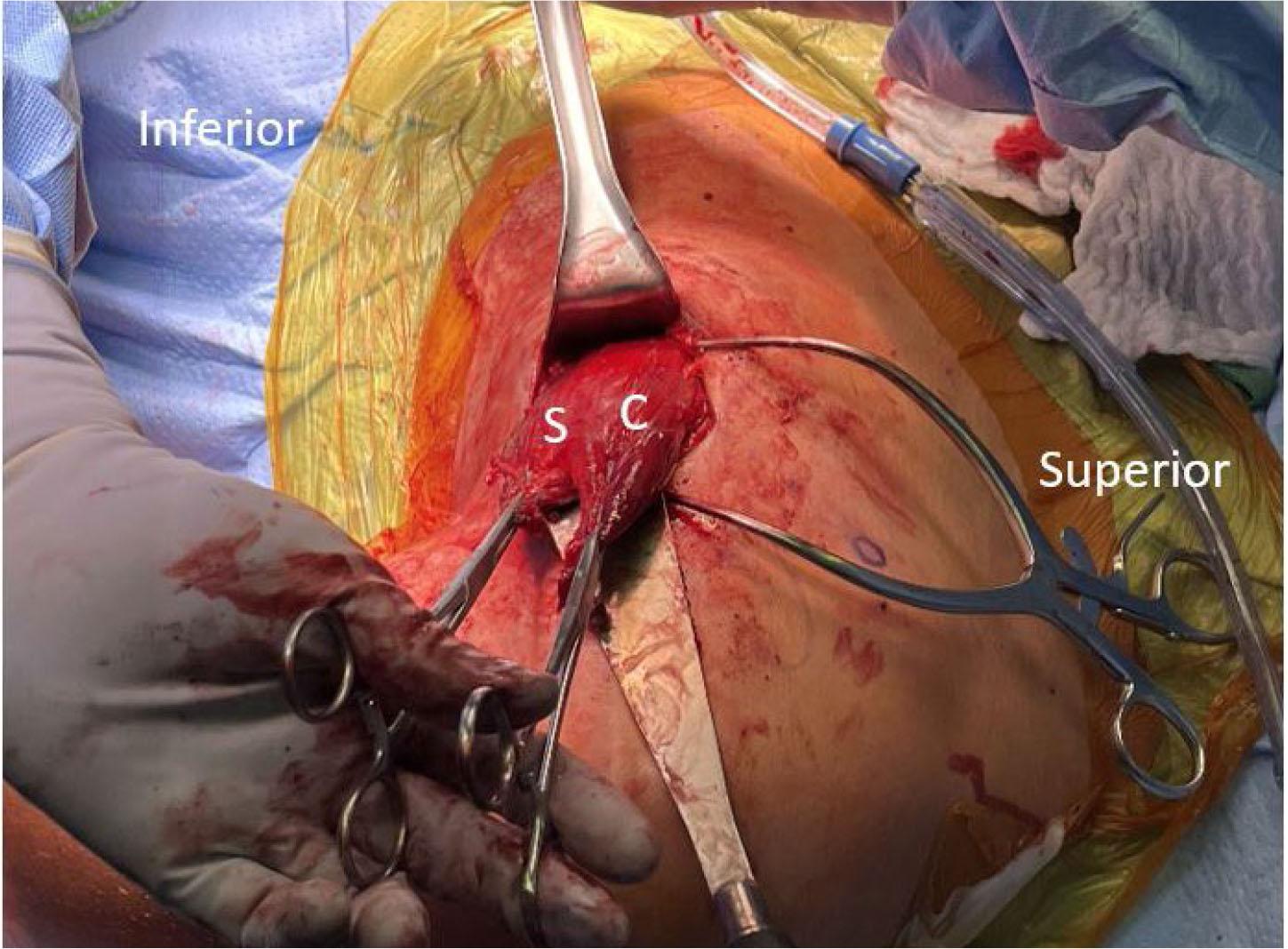 Intra-operative clinical photo of a left shoulder during PM tendon reattachment at the humeral insertion. The clavicular head (C) is superficial and superior to the sternal head (S). Both tendon stumps are clamped and will be sutured to attach to the proximal humerus