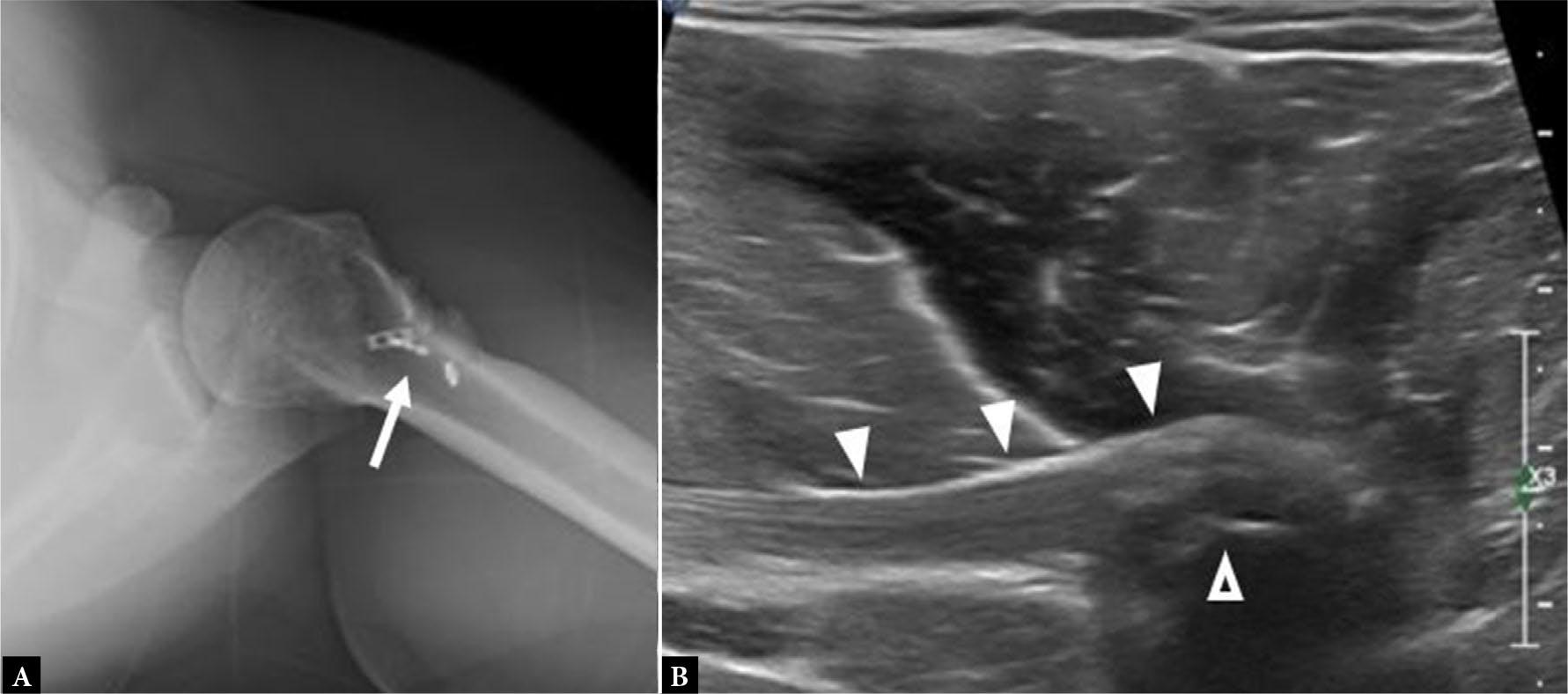A. Axillary shoulder radiograph shows endobuttons from previous PM tendon repair (arrow). B. Long axis gray scale ultrasound image shows the intact repaired PM tendon (solid arrowheads) and echogenic artifact from the surgical hardware with posterior acoustic shadowing (open arrowhead)