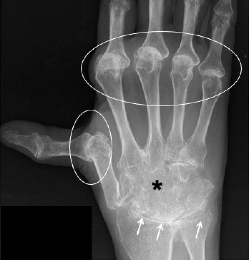Rheumatoid arthritis (RA): AP radiograph of the hand demonstrates periarticular osteopenia (reduced bone density around the joints); reduced radiocarpal and intercarpal joint spaces; erosions (arrows), and subluxation of the metacarpophalangeal joints (white circles). Ankylosis of the intercarpal joints (asterisk) is seen in this case, which can be a feature of chronic untreated rheumatoid arthritis