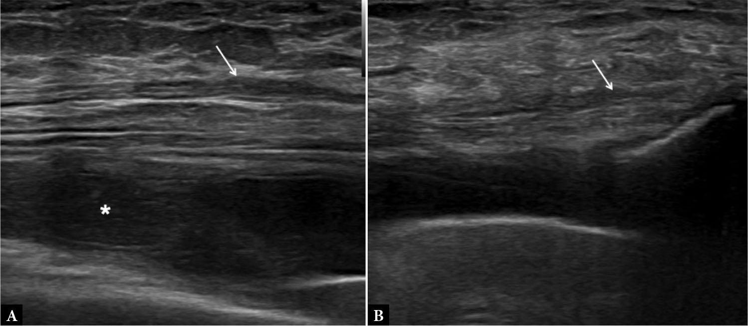 Synovitis. Long-axis US image of the suprapatellar knee showing echogenic synovium (asterisk in A) which is partially compressible on probe pressure, as seen in image B. Arrows indicate the quadriceps tendon