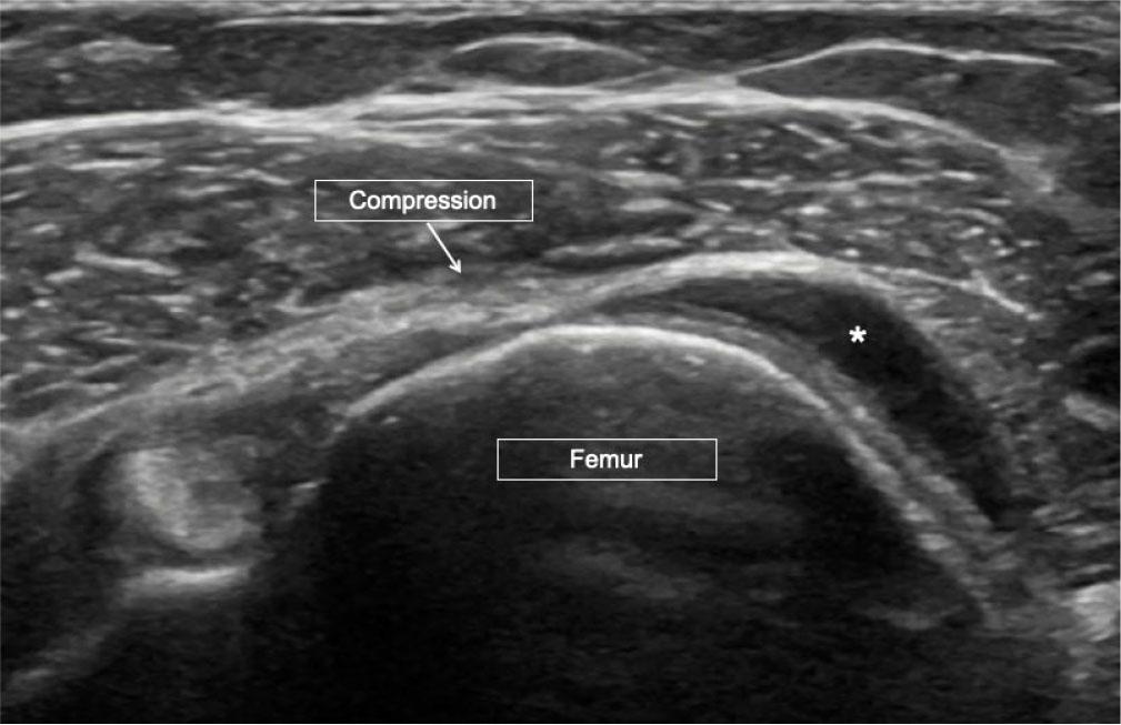 Joint effusion. Short-axis US image of the shoulder joint with absent rotator cuff. Central compression (arrow) shows complete compression and displacement of the joint fluid (asterisk)