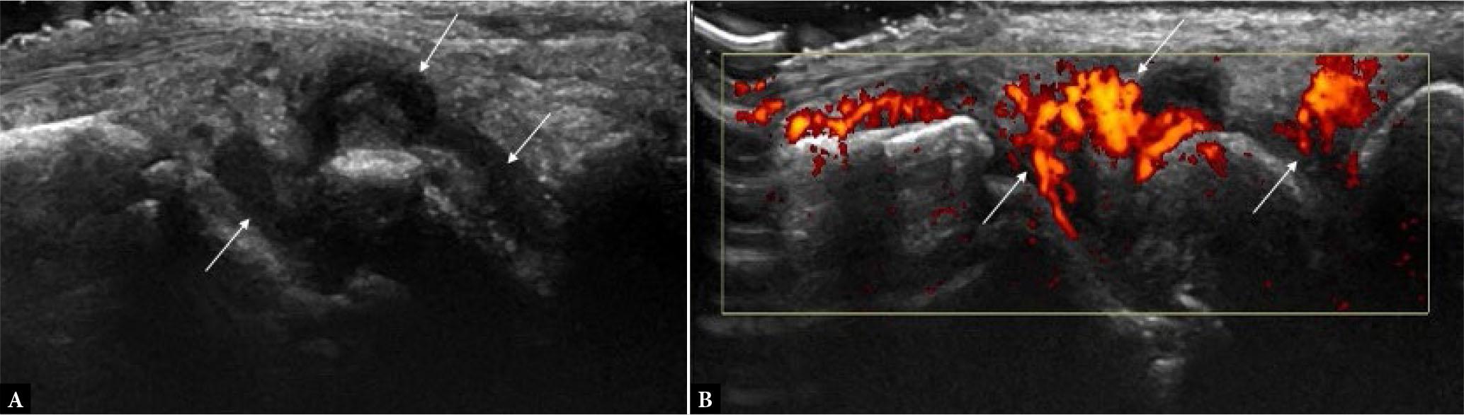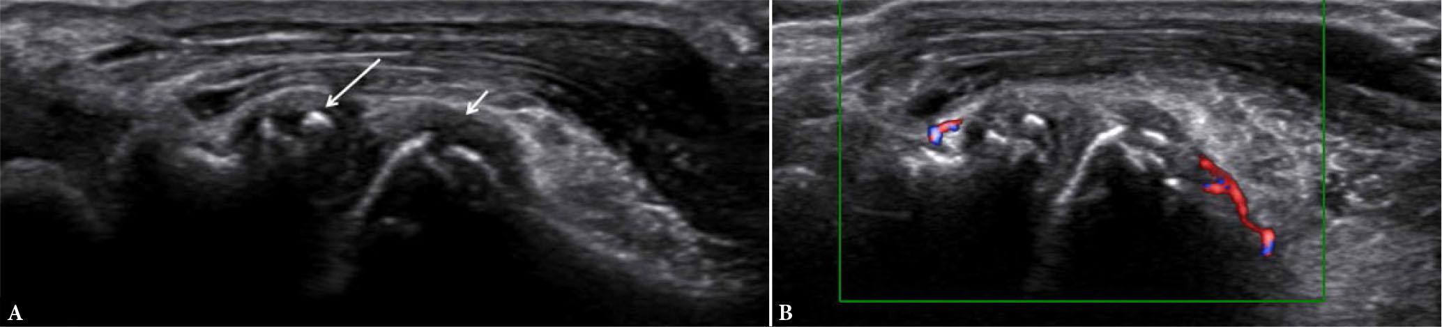 Greyscale (A) and power Doppler (B) long-axis US images of wrist joint depicting hypoechoic synovial proliferation (arrows in A) distending the joint capsule with diffuse vascularity (arrows in B)