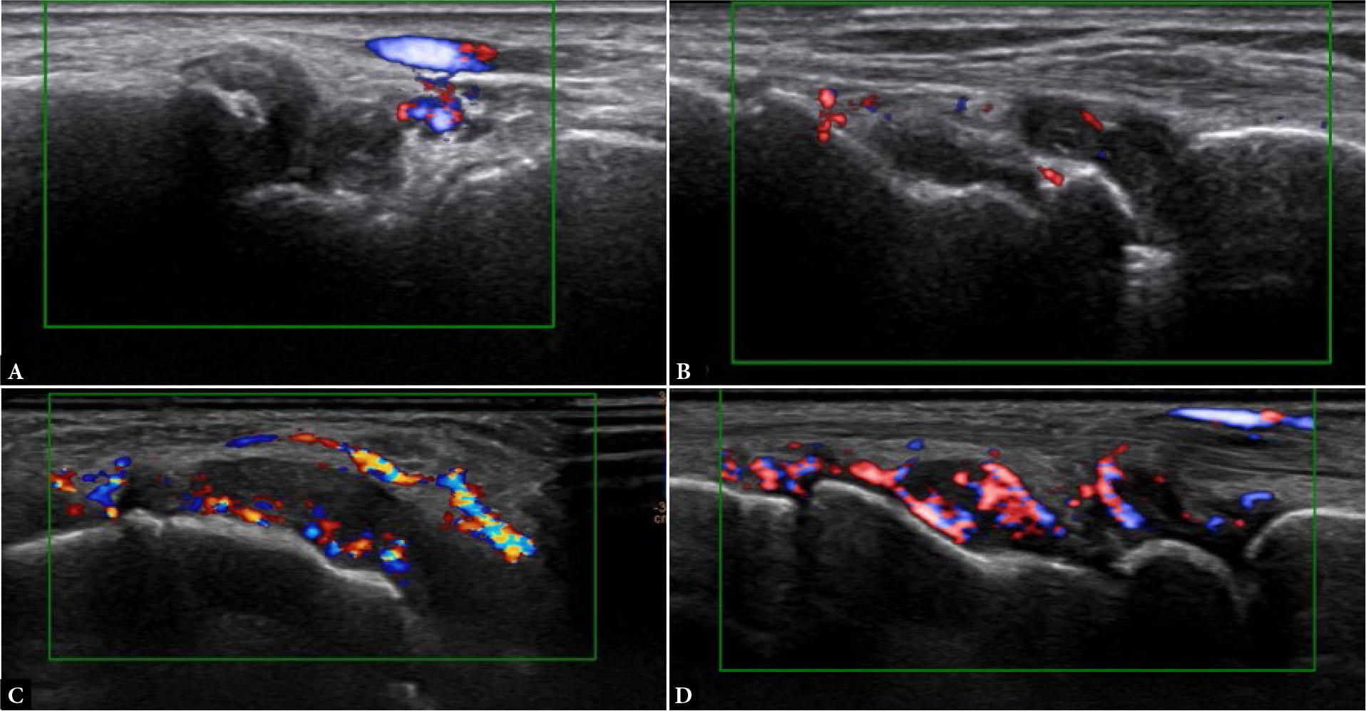 Power Doppler synovitis grading. Long-axis PDUS of the wrist joint shows grade 0 –no flow (A); grade 1 – single-vessel signal (B); grade 2 – less than half of the area of the synovium-filled with vessels (C); grade 3 – more than half of the area of the synovium filled with vessels (D). Note: the Doppler signal in (A) is from the periarticular vessels and not the synovium