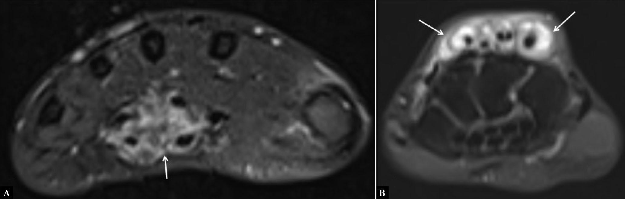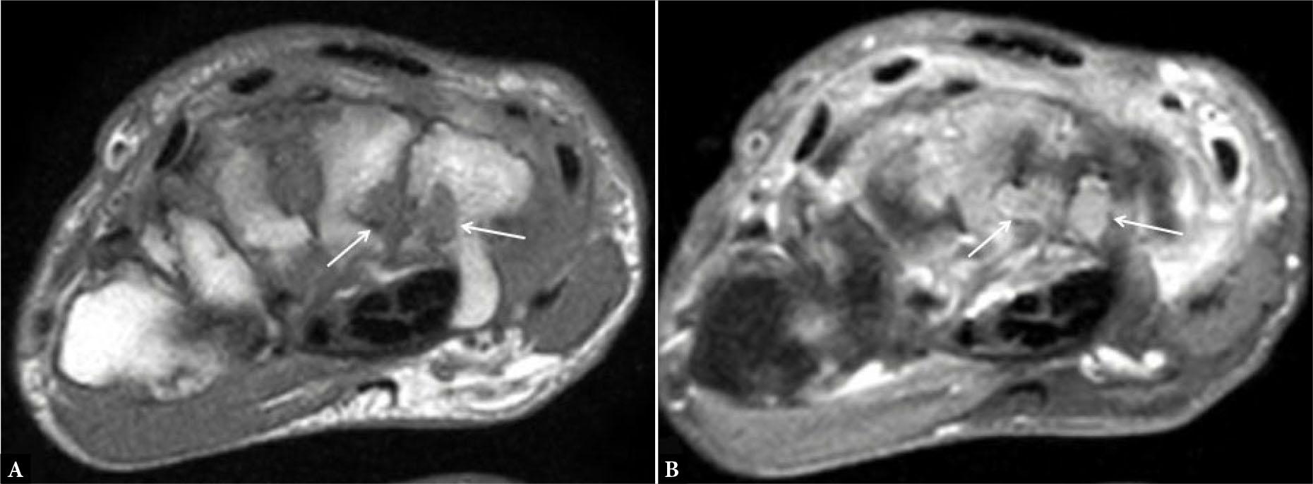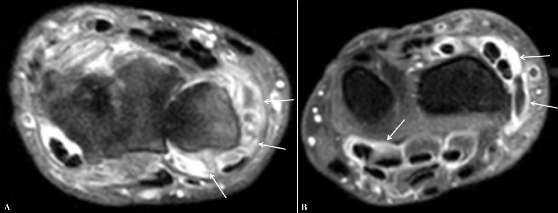 Axial post-contrast T1-weighted (T1W) fat-suppressed image of the distal radioulnar joint shows enhancing synovium (arrows in A), suggesting synovitis along with enhancement of the flexor and extensor tendon sheaths (arrows in B), consistent with tenosynovitis