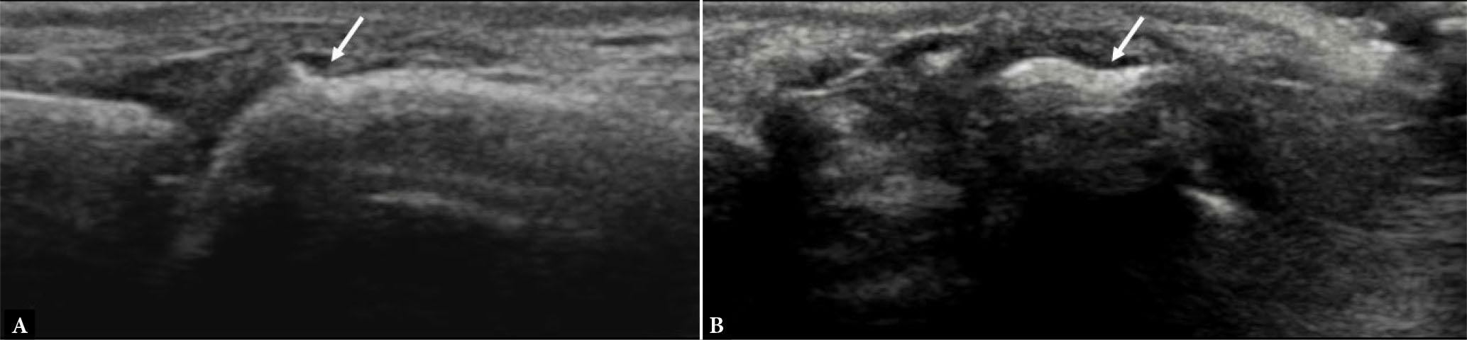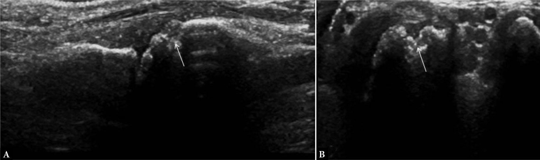 Grayscale US images of the 2nd metacarpal head in two orthogonal planes (A and B) show normal anatomical depression of dorsal cortical bone surface (arrows) mimicking erosion
