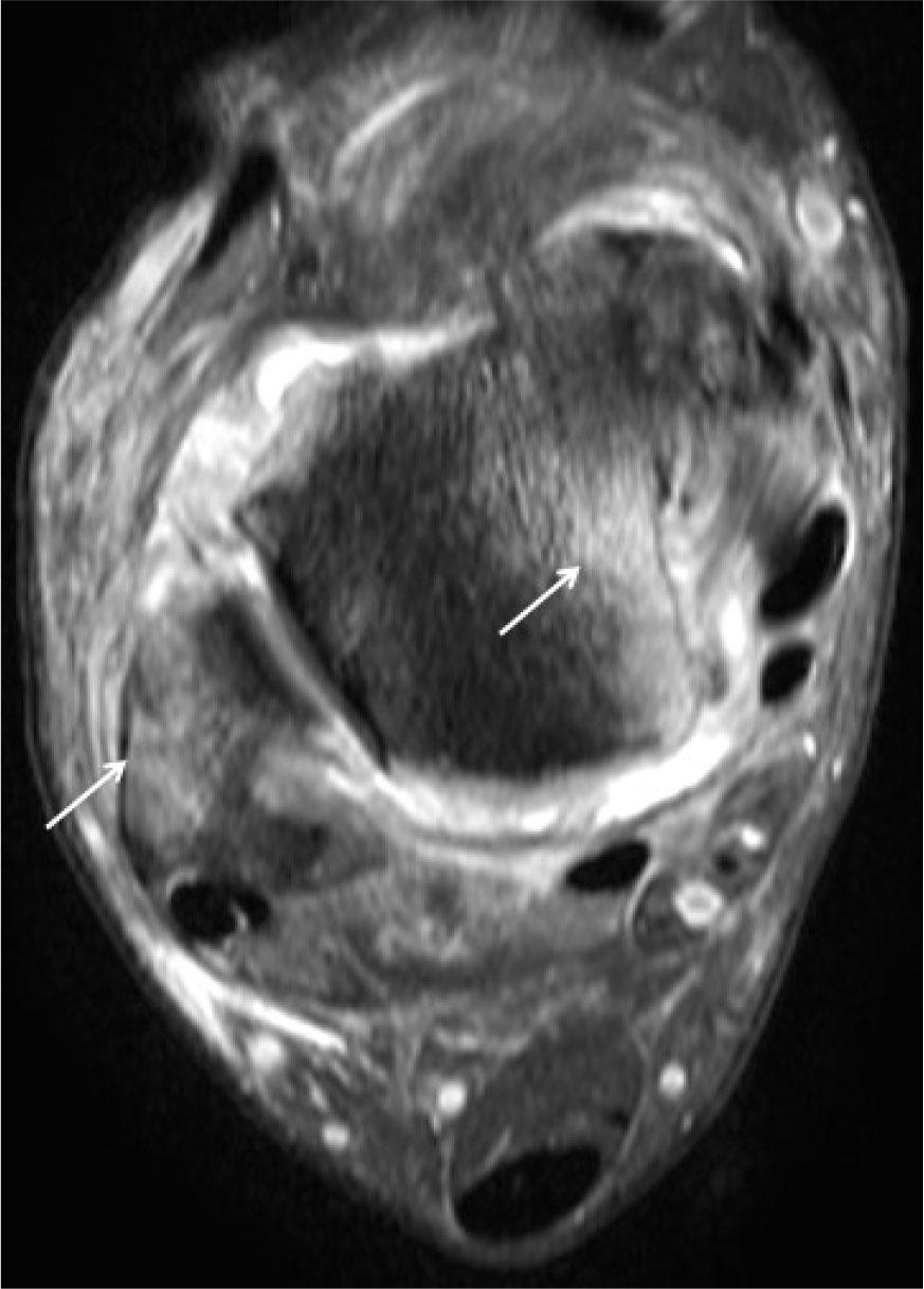On MRI, tenosynovitis appears as peritendinous fluid with thickening and enhancement of the tendon sheath (Fig. 13).