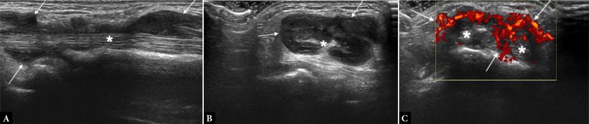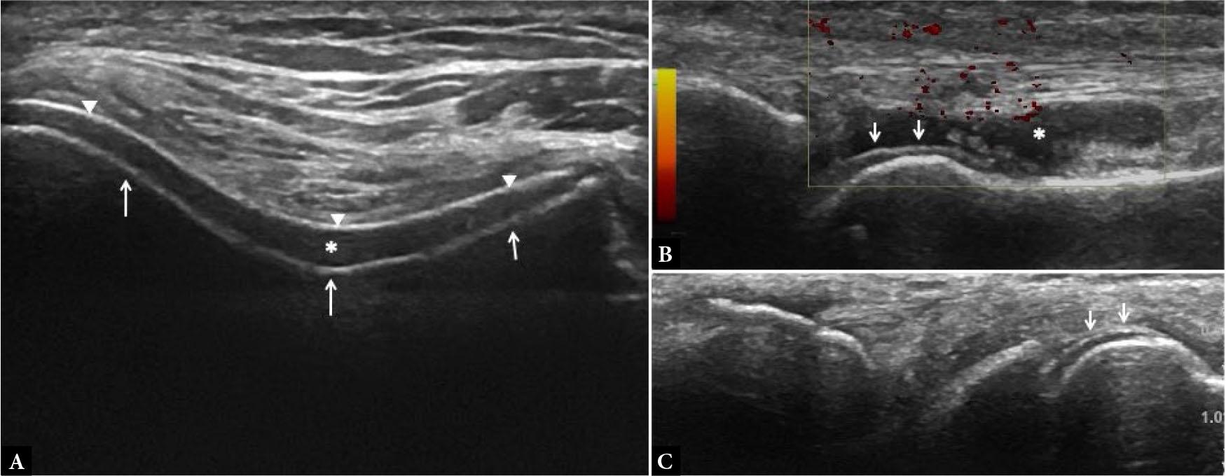 Tenosynovitis. Long- (A) and short-axis (B,C) US images of the 2nd extensor compartment tendons at wrist joint show circumferential hypoechoicteno-synovial proliferation (arrows in A and B) with significant power Doppler signal (arrow in C) suggestive of active tenosynovitis, in a known case of RA