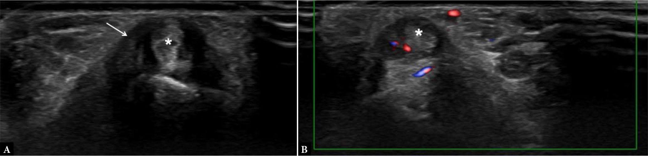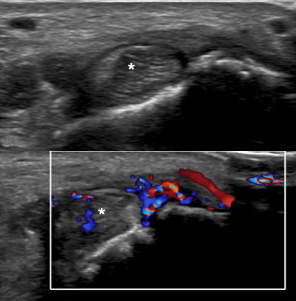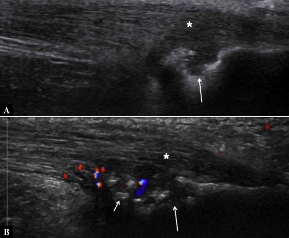 Enthesitis. Short-axis grayscale (A) and power Doppler (B) US images of tibialis posterior tendon (asterisks) show intra-tendinous and peritendinous thickening and power Doppler signal