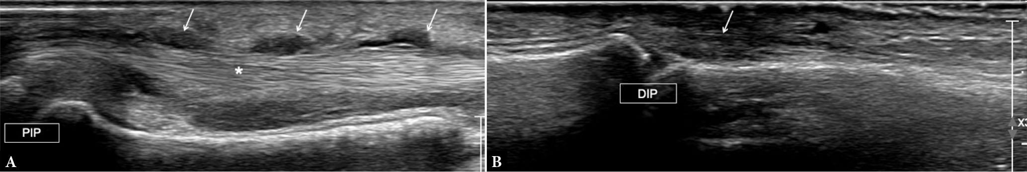 Dactylitis. Long-axis US image of flexor tendons (A) and extensor tendon (B) of the fingers of the same patient show tenosynovial proliferation (arrows in A) around flexor tendons (asterisk), representing tenosynovitis. There is thickening of the extensor tendon (arrow in B) at its insertion to the distal phalanx. PIP – proximal interphalangeal joint; DIP – distal interphalangeal joint