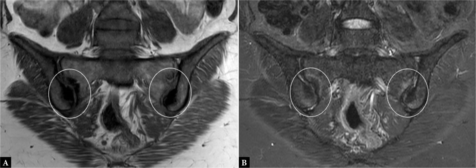 Sacroiliitis. Coronal oblique T1-W (A) and STIR (B) MR images of sacroiliac joints show bilateral symmetrical periarticular BME (hyperintensity within the circles in B) with areas of sclerosis (hypointensity within circles in A). There is a mild reduction in joint spaces and irregularity of articular marginsv
