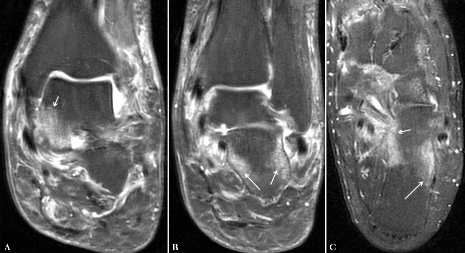 Enthesitis. MR proton density fat-suppressed coronal (A and B) and axial images of the ankle show extensive marrow edema (hyperintensity) at the attachment sites of ligaments (small arrows in A and C); retinaculum (arrows in B) and fascia (long arrow in C)