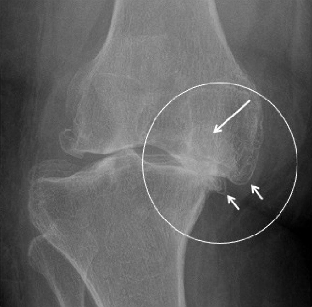 Severe osteoarthritis (OA). AP radiograph of the right knee shows marginal osteophytes (small arrows), medial joint space narrowing (circle), subchondral sclerosis, and subchondral cysts (long arrow)