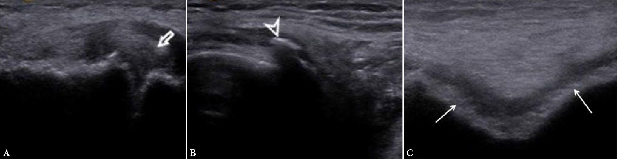 Osteoarthritis (OA). Long-axis US images of the knee joint show meniscal extrusion (arrow in A), osteophyte (arrowhead in B), and cartilage damage of trochlea (arrows in C), cartilage appears heterogeneous, with uneven thickness and fuzzy contours