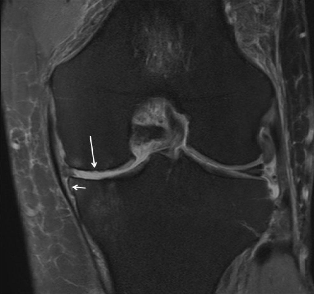 Osteoarthritis (OA): MR proton density fat-suppressed coronal image shows cartilage damage with cortical irregularity (long arrow) and osteophyte (small arrow). There is also tear of medial meniscus