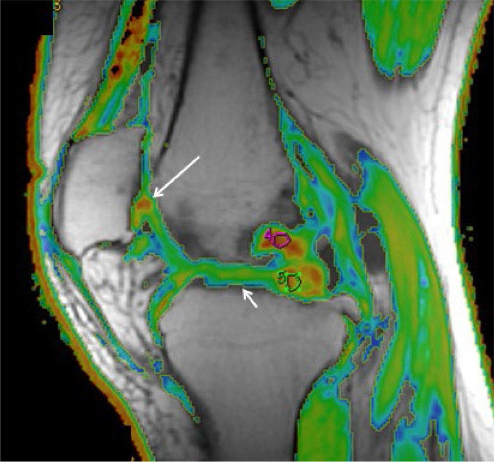 DCE-MRI allows measurement of tissue perfusion and has clinical applications in the assessment for synovial changes to help guide diagnosis, monitor disease activity, and evaluate treatment efficacy. For example, reduction in synovial perfusion has been shown to be a more sensitive indicator of treatment response than synovial volume(30).