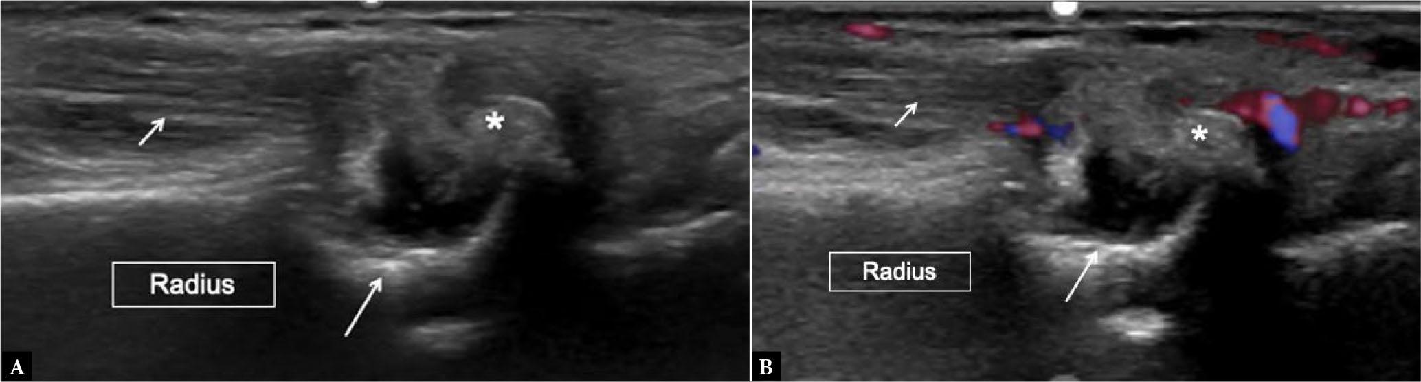 Gout. Long-axis grayscale (A) and power Doppler (B) US image at the wrist joint shows large overhanging erosion in the radius (long arrows) adjacent to extensor digitorum tendon (short arrows). There is a large echogenic tophus overlying the erosion (asterisks) with surrounding power Doppler signal (B)