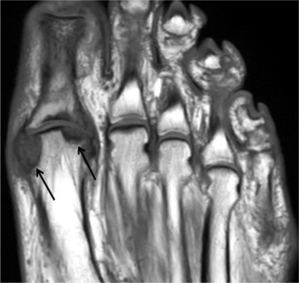 Gout: Coronal T1-W MR image of the foot shows large hypointense erosions in the head of the 1st metatarsal (black arrows) with adjacent hypointense tophi. There is also a large hypointense tophus over the base of the 5th metatarsal (white arrow). Note the characteristic clearly demarcated erosion