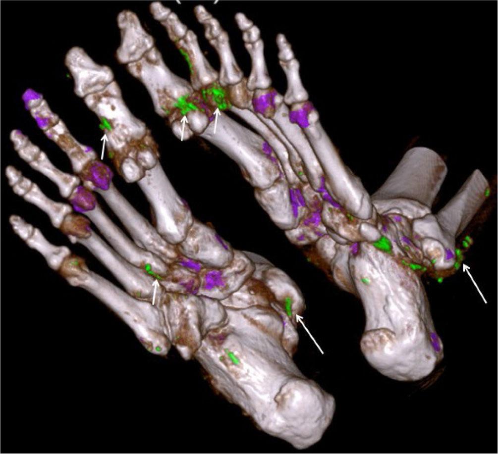 Dual-energy CT (DECT) in gout: 3D reconstructed image of DECT of both feet in a patient with gout shows green color-coded crystal aggregates around the joints (small arrows) and along the tendons (long arrows)