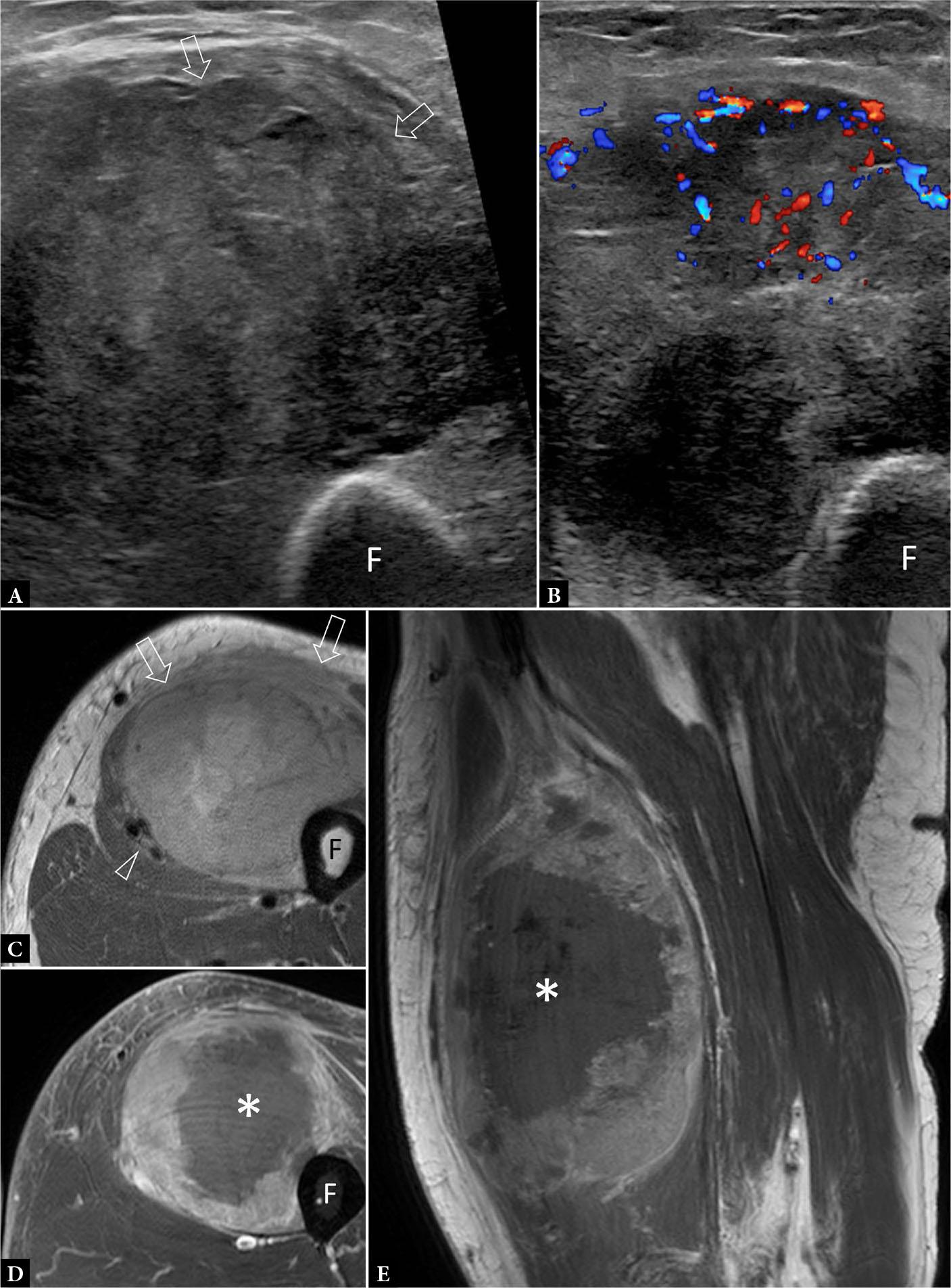 63-year-old male with enlarging thigh mass for five months. Transverse A. greyscale and B. color Doppler ultrasound show large moderately hyperemic mass (arrows) partially encasing the femoral (F) cortex. The large size, rapid growth, and moderate hyperemia make sarcoma most likely. No necrosis is evident. C. Axial proton-density weighted image shows that the tumor contacts, but does not infiltrate, the femoral cortex. The femoral neurovascular bundle (NVB) is also not infiltrated (arrowhead). T1-weighed fat-saturated post-contrast D. axial and E. sagittal images show that the central tumor area (*) is non-enhancing, compatible with necrosis. The necrosis cannot be appreciated on ultrasound A., B. Percutaneous biopsy of the tumor margins revealed a pleomorphic rhabdomyosarcoma