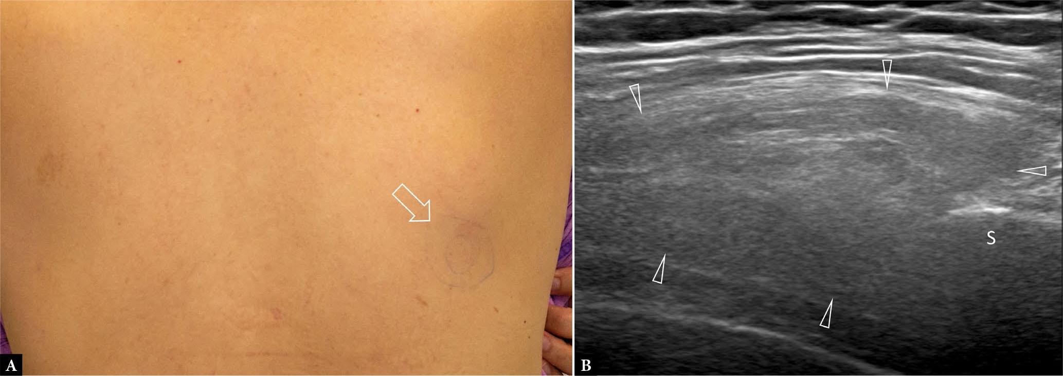 56-year-old female with discomfort and swelling in the infrascapular region. A. Clinical photograph shows site of swelling (arrow) marked by the patient prior to US examination. B. Transverse US shows a large mass with alternating hypoechoic bands (which are compatible with fibrous tissue) and hyperechoic bands (which are compatible with fatty tissue) at the inferior tip of the scapula (S). The mass was mildly compressible. No tumor vascularity was present on color Doppler imaging (not shown). This fibrolipomatous-type mass (arrowheads) is consistent with elastofibroma dorsi